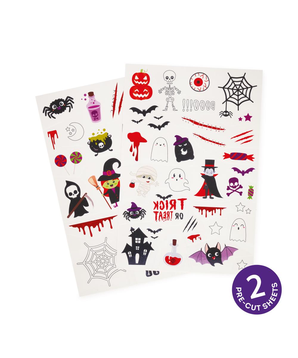 This themed pack includes over 50 tattoos across 2 sheets. Glow in the dark and easy to apply and remove. Features skeletons, vampires, ghosts and witches. Water and sweat resistance. Dermatologically tested.