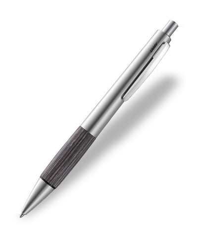 The LAMY accent ballpoint pen is a sleek writing instrument of metal construction with a grey wood grip section.