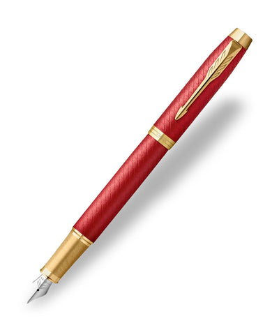 About Parker IM Premium Fountain Pen - Red with Gold Trim Focused on comfort and simple, high-performance functionality, the tapered contemporary shape of the new Parker IM Premium fountain pen teams up with the versatile appeal of metal to give instant, modern style. IM utilises a push on cap with...