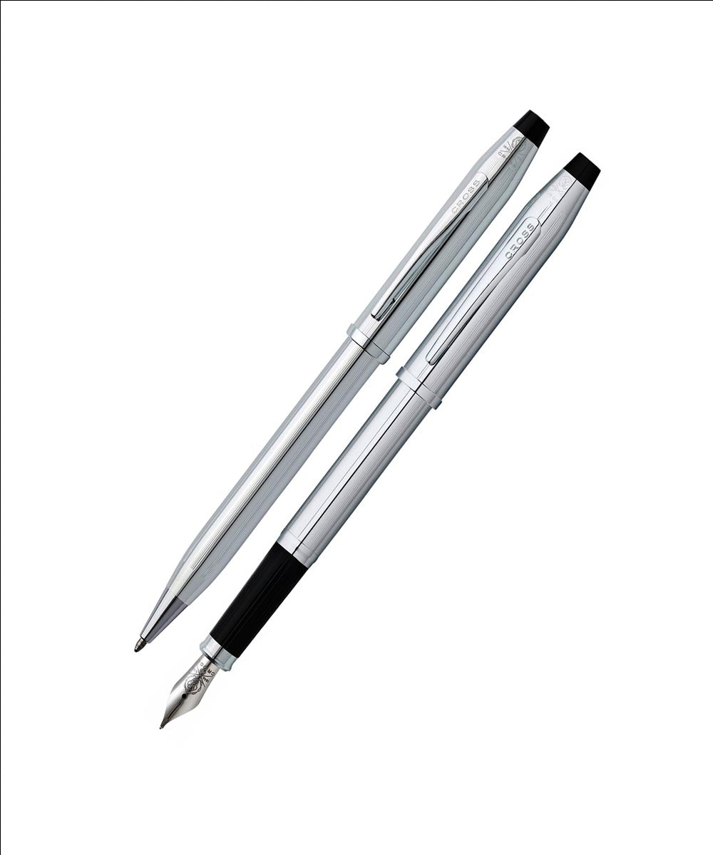 Gift set including 1x Cross Century II Fountain Pen with medium nib and 1x Cross Century II Ballpoint pen, both in the Lustrous Chrome finish.