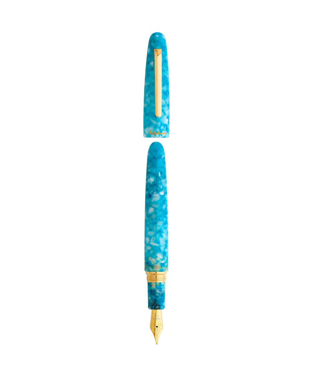 The Estie Aqua embodies all these words and experiences in a writing instrument. Its acrylic captures the mother of pearl luminosity of shells and the technicolor hue of deep, aqua waters.