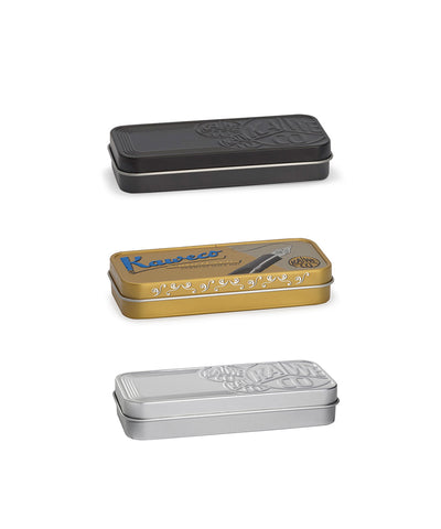 About Kaweco Metal Gift Tin - Small This embossed retro style metal gift tin will help protect your Kaweco Sport or Liliput pens from getting scratched whilst not in use or damaged if dropped. Will accomodate 1 or 2 pens and has a lined inner tray. Available in Black, Gold...