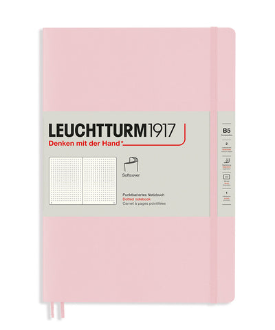 About Leuchtturm1917 Composition (B5) Softcover Notebook - Powder Slim and flexible and with all the usual details including gusseted pocket inside the back cover, contents page, numbered pages, space on the front and spine for labelling, thread stitching with 8 perforated removable sheets, elastic band fastener and bookmark. This size rests...