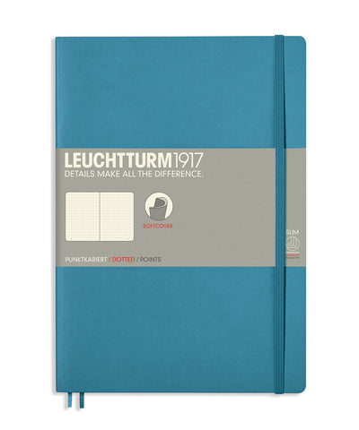 About Leuchtturm1917 Composition (B5) Softcover Notebook - Nordic Blue Slim and flexible and with all the usual details including gusseted pocket inside the back cover, contents page, numbered pages, space on the front and spine for labelling, thread stitching with 8 perforated removable sheets, elastic band fastener and bookmark. This...
