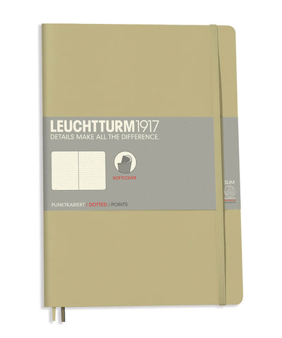 About Leuchtturm1917 Composition (B5) Softcover Notebook - Sand Slim and flexible and with all the usual details including gusseted pocket inside the back cover, contents page, numbered pages, space on the front and spine for labelling, thread stitching with 8 perforated removable sheets, elastic band fastener and bookmark. This size...