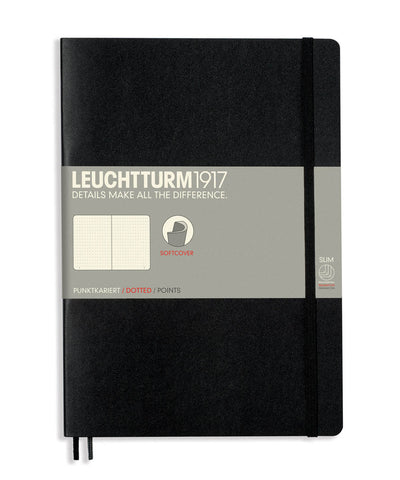 About Leuchtturm1917 Composition (B5) Softcover Notebook - Black Slim and flexible and with all the usual details including gusseted pocket inside the back cover, contents page, numbered pages, space on the front and spine for labelling, thread stitching with 8 perforated removable sheets, elastic band fastener and bookmark. This size...
