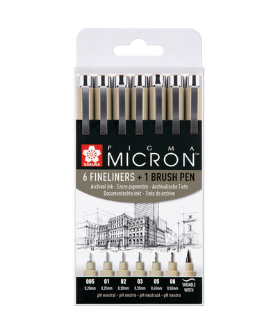 About Pigma Micron/Brush Pen Set - Black The Sakura Pigma Micron is a pigment liner pen that comes in 8 different tip sizes. Contains permanent, waterproof, archival quality ink that conforms to ASTM D4236. This set contains the six most popular Pigma Micron pens and a Pigma Brush pen. The Pigma...