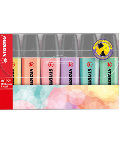 About Stabilo Boss Original Pastel Highlighter Pens - 6 Assorted ColoursStabilo Boss Original highlighter pen, the original and market-leading highlighter pen, first introduced in 1971! Incomparable design classic. Stabilo anti dry-out technology: 4 hours cap off dry-out protection. Writes with 2 line widths, 2mm and 5mm. Water based ink. Low...