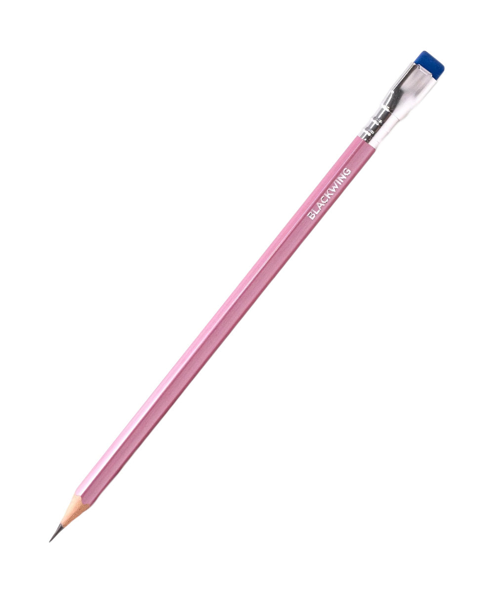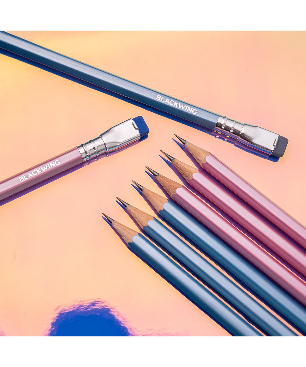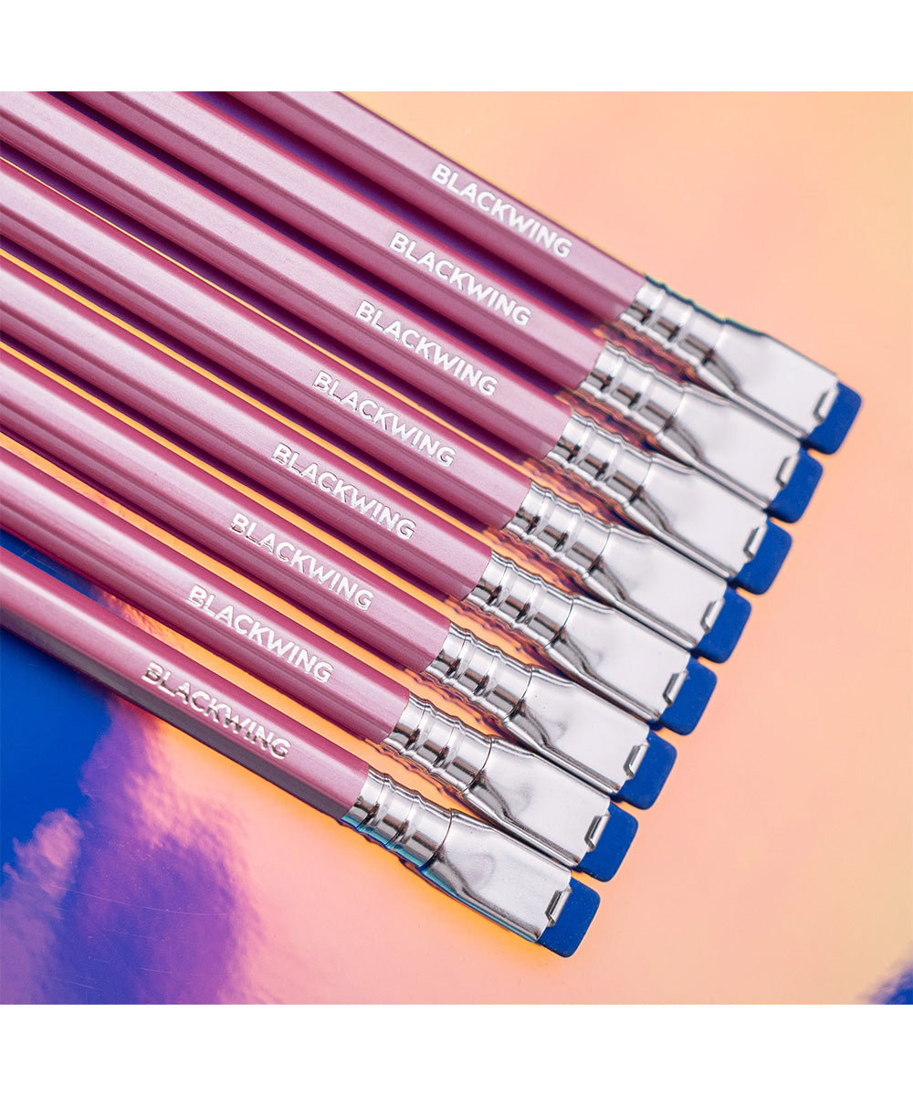 Each pencil features genuine incense-cedar barrels sourced from California in a pearlescent pink finish, iconic square Blackwing ferrule, silver imprint, and bright blue eraser.