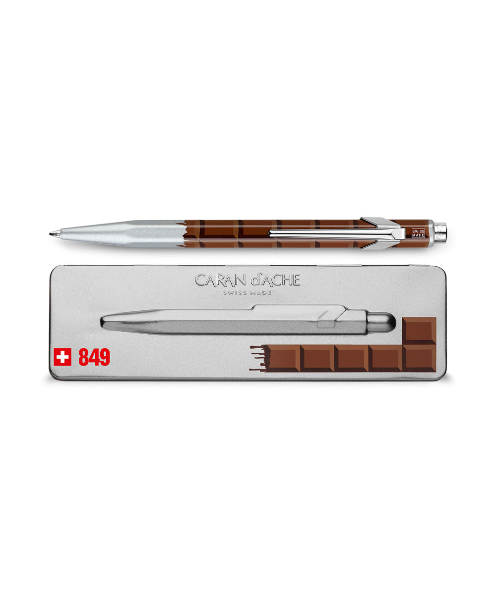 The Caran d'Ache 849 Chocolate Ballpoint Pen features the traditional 849 hexagonal aluminium body with chrome pocket clip and printed with a Swiss chocolate image.
