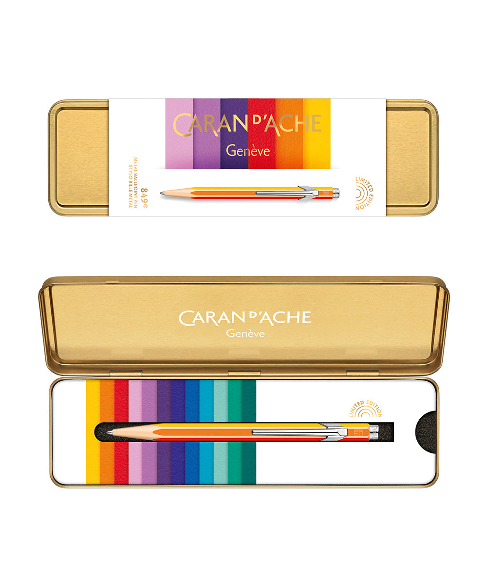 The Caran D'Ache 849 Christmas 2022 Limited Edition Ballpoint Pen has the traditional hexagonal shape of the famed Swiss ballpoint and comes in a golden gift tin with a multicoloured band.