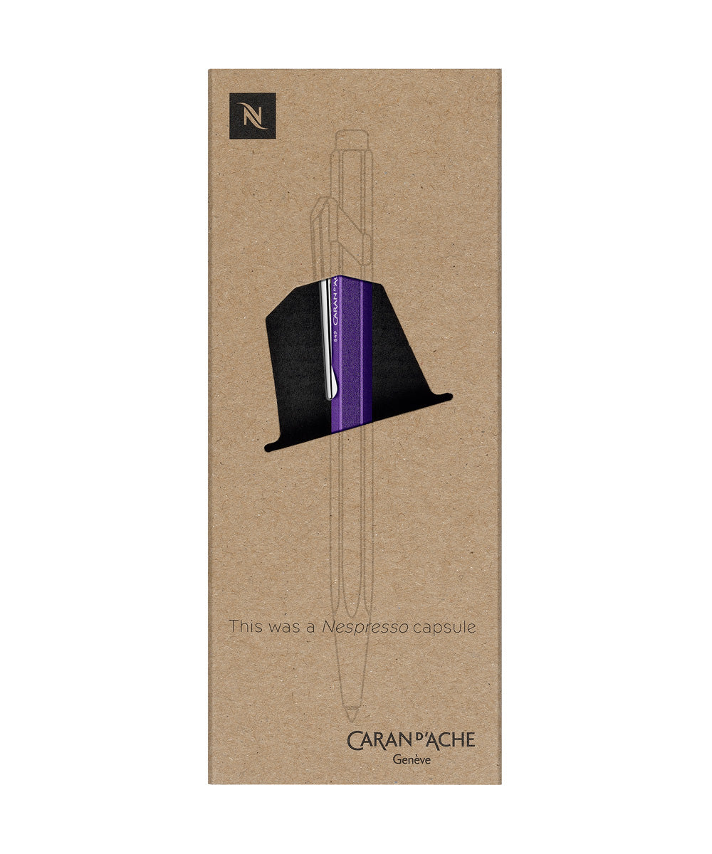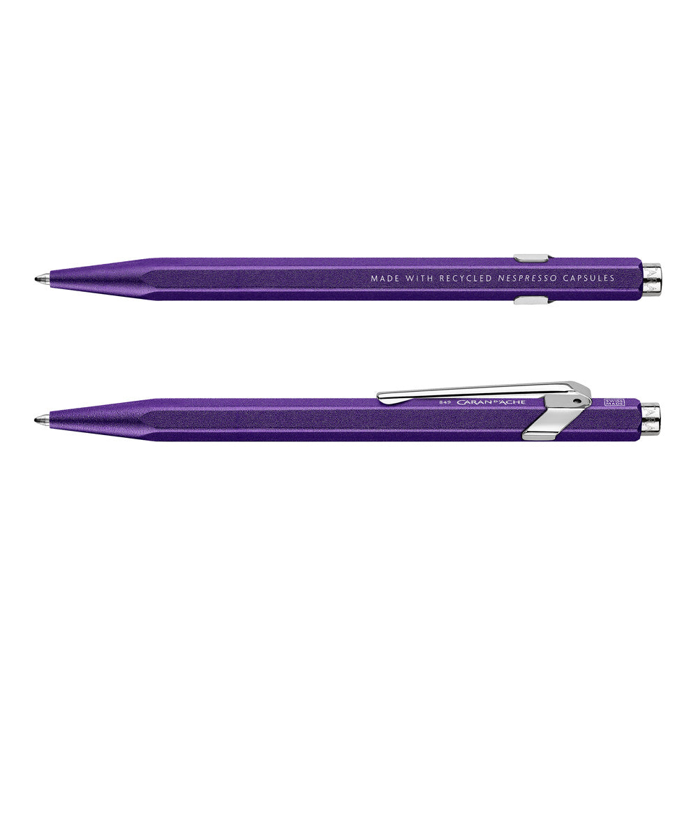 In collaboration with Nestlé, Caran D'Ache have released the 3rd edition 849 Nespresso model. Using the aluminium of recycled Nespresso coffee capsules they created an alloy that retains the intrinsic qualities of the world famous 849 ballpoint pen. Produced in the Geneva workshops of Caran D'Ache, the finish on this superb 849 displays the satin purple colour of the Nespresso Arpeggio capsule.