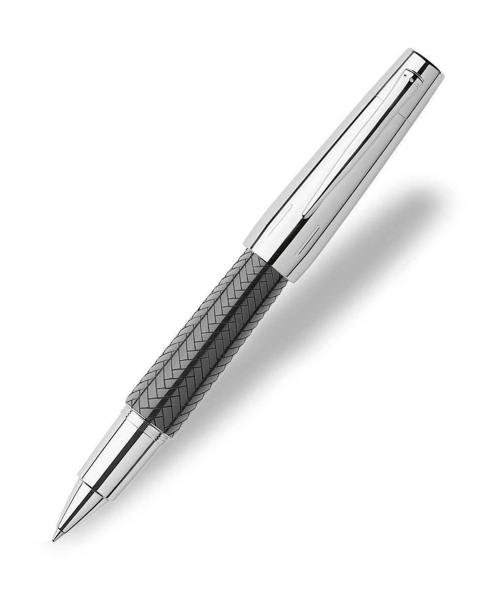 The Faber-Castell e-motion rollerball pen in Black Parquet has a subtle parquet design engraved into the glossy black lacquer barrel resulting in a stunning pen that is complemented by polished chrome appointments. Shaped almost like a cigar, it has a subtle refinement that is sure to please the writer.