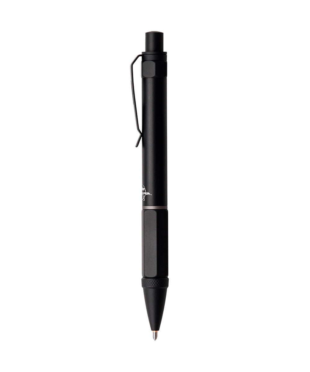 The Mountaineer Clutch Space Pen from Fisher comes in a matt black finish and is a big chunky pen weighing in at 33g compared to the familiar bullet Space Pen. The pen comes with an integral pocket clip and is retractable using the push button mechanism.