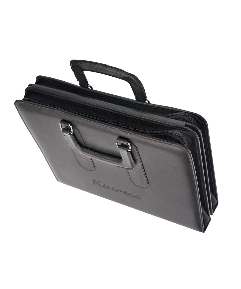 A high-quality leather zipped presentation case for up to 104 pens. There are two separate compartments each with a velvet separator and lining. The pens are held in place with strong elastic loops. The exterior is matt black and blind embossed with the Kaweco logo.