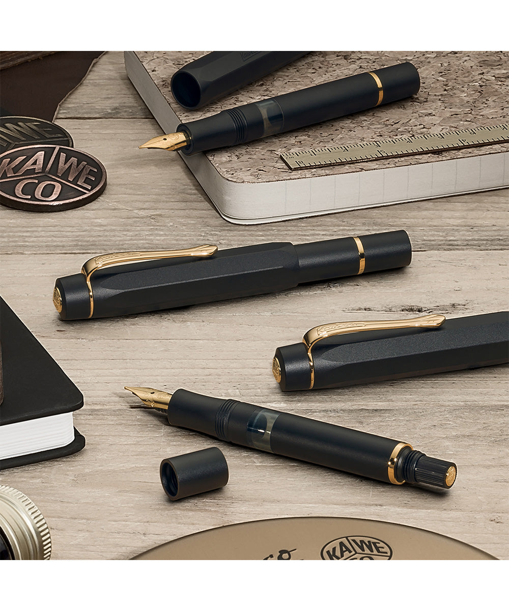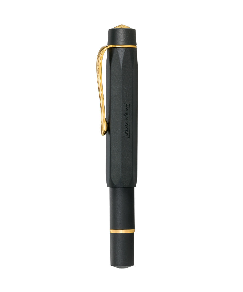 The Kaweco Sport Piston Filler has a matte black anodised aluminium body, which is durable and gives the pen a high-quality haptic. The perfect balance between the weight and diameter of the fountain pen ensures comfort during long periods of writing. The matte surface contrasts perfectly with the shiny golden elements including a golden integrated clip - which enhances the functionality with stylish elegance.
