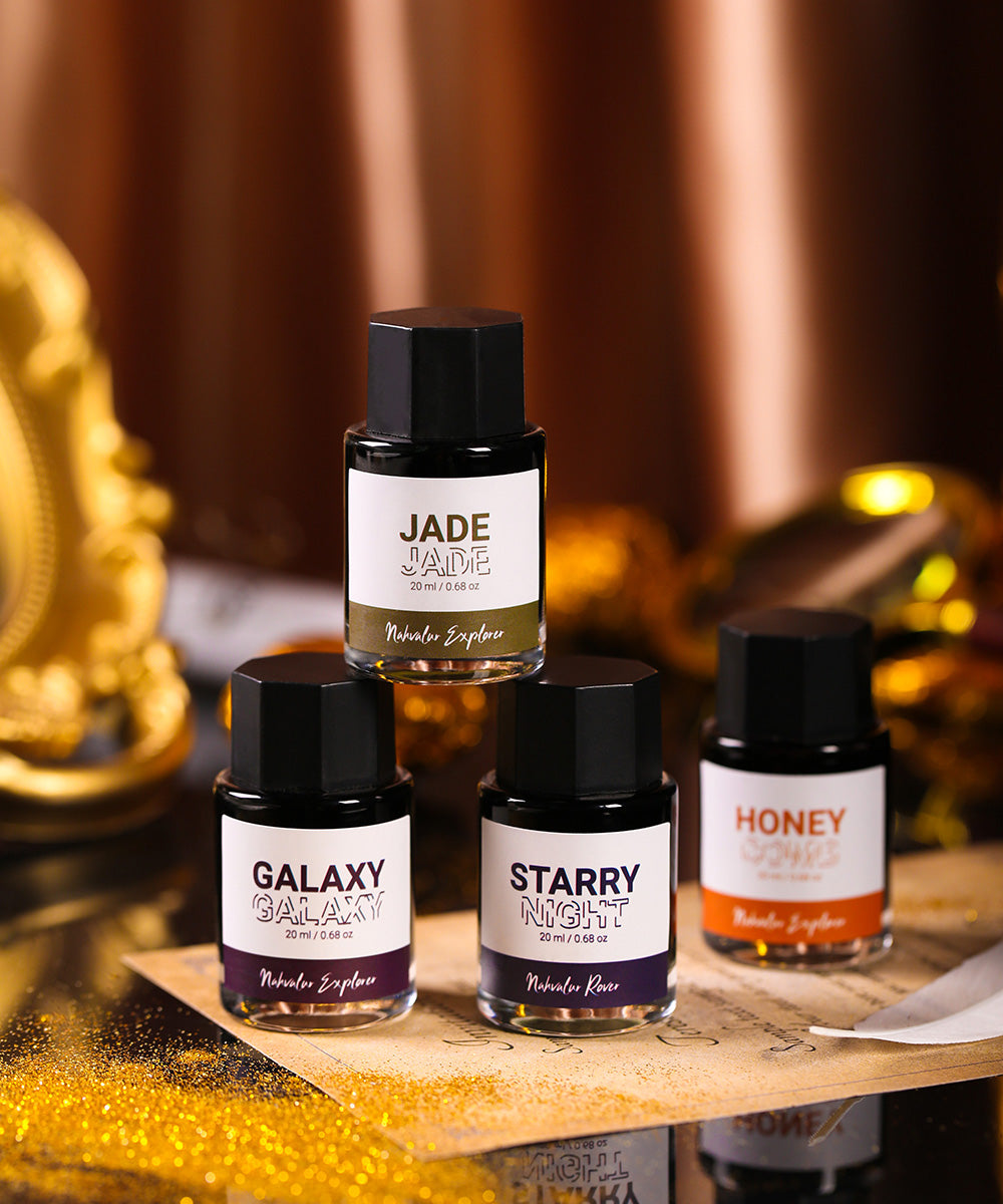 The Nahvalur Rover ink collection includes four fountain pen inks - Galaxy, Honeycomb, Jade and Starry Night - each reflecting the unique style of a Nahvalur fountain pen. Crafted with an accompanying lighthouse illustration in the corresponding ink colour, the 20ml round glass bottles are capped off with a hexagonal lid. All of these inks are pH neutral, quick-drying and boasts a shimmer effect, enhancing your writing with a subtle glimmer and helping your words to shine.